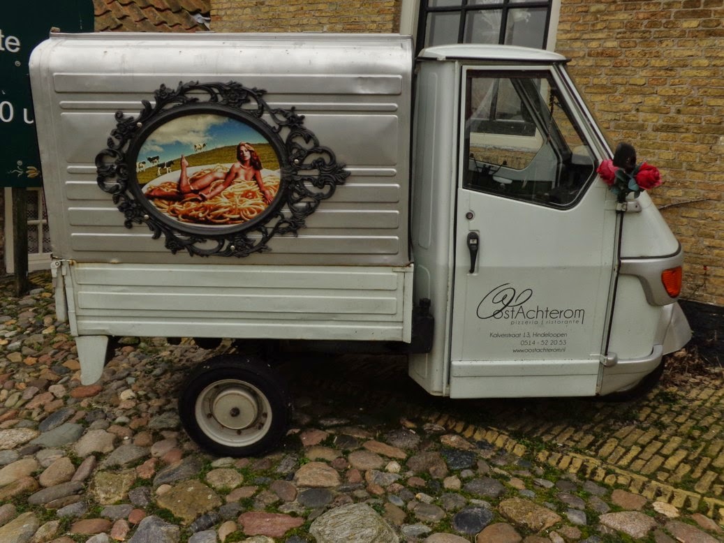 wij het niet verklaren, het reclameschild op dit pizza-bezorg-autootje.
